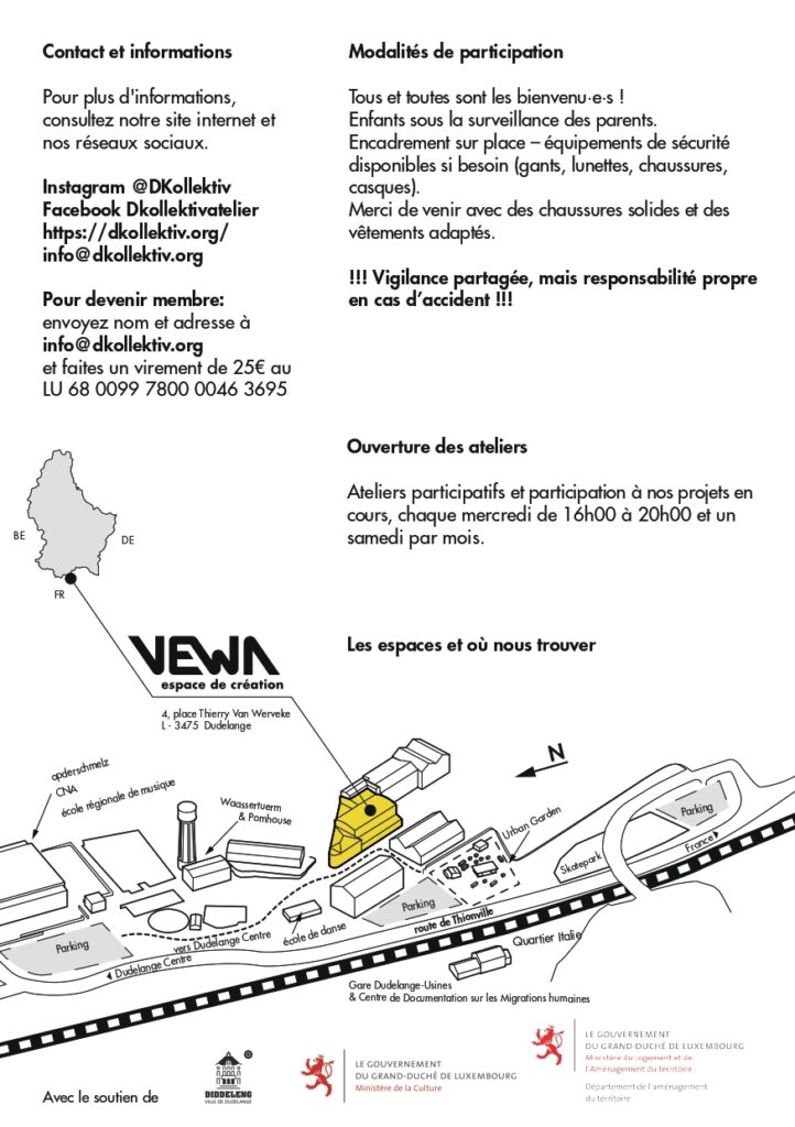 Jettez un coup d’oeuil sur le site VEWA.lu pour les évènments actuels de tous les partenaires et sur les évènements facebook du DKollektiv.